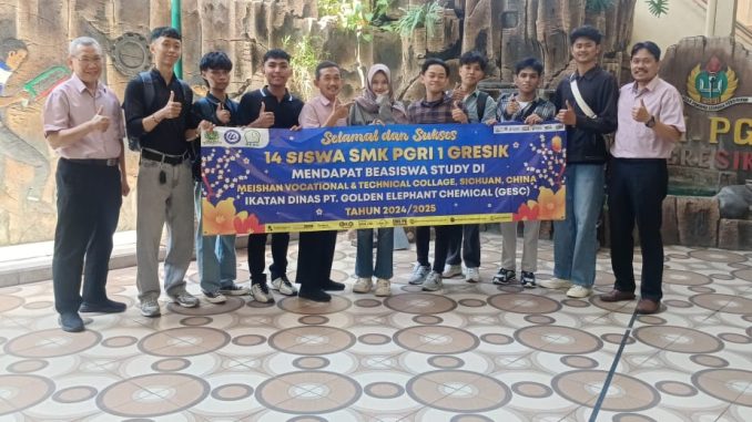 Gresik, 17 September 2025 – SMK PGRI 1 Gresik kembali menorehkan prestasi membanggakan. Sebanyak delapan siswa resmi diberangkatkan untuk melanjutkan studi di Meisan Vocational & Technical College, Sichuan, China melalui program beasiswa penuh dengan ikatan dinas bersama PT. Golden Elephant Chemical (GESC).